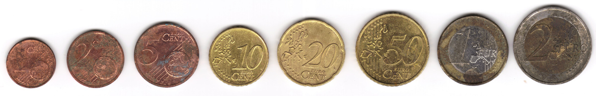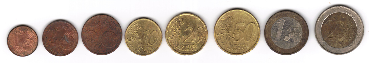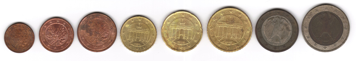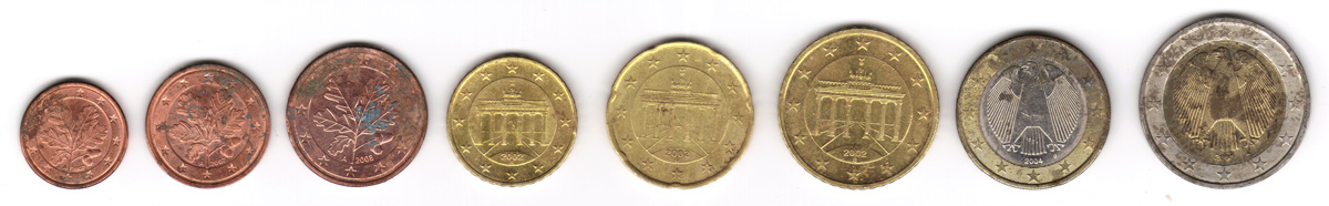 Die 1 – 5 Cent Stücke zeigten auf dem galvanisierten Kupferüberzug den Ansatz von Patina (Grünspan). Allgemein haben diese Münzen den Glanz verloren und machen einen stumpfen und fleckigen Eindruck. Eine Ablösung des Kupferüberzuges sowie Blasenbildung auf der Oberfläche war nicht zu erkennen.